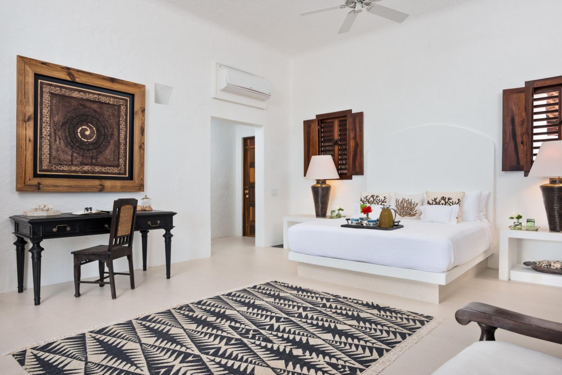 Bedroom 1 Master: Luxurious King-sized bed, Wi-Fi, Flat-screen TV, Apple TV, Prime Videos, Netflix and DVD Player, Rain showers, separate toilets, Bathrooms with freestanding bathtub, shower, twin vanities, Living area with reading corner, writing desk, Separate walk-in closet and safe. Private Terrace & Ocean Views.
