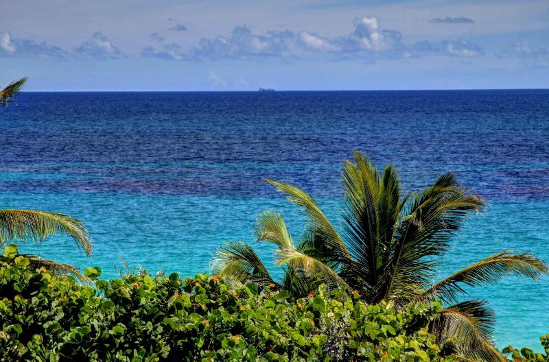 The kitchen, living and dining are located on the upper storey ,of this two storey home. The living areas on the upper level have high ceilings, giving the home an open and airy feeling. On all sides of the house, windows and French doors open onto a wide veranda, where guests can enjoy cool ocean breezes and breathtaking views of both the turquoise sea and harbour.